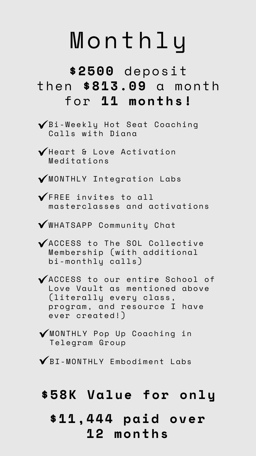 Designed for the woman who’s in a relationship or calling in love, who knows in the deepest part of her being that she gets to be in partnership without needing to sacrifice or over give. Who gets to remain feminine and free and trust she’ll be held by the masculine - by men and money.